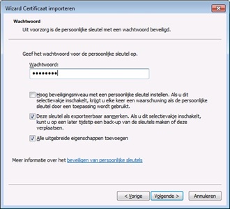 2. Wachtwoord invoeren en vinkjes, Voer als eerste het wachtwoord van het certificaat in, vervolgens moeten de vinkjes bij “Deze sleutel als exporteerbaar aanmerken” en “Alle uitgebreide eigenschappen toevoegen” worden aangevinkt.