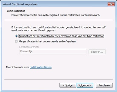 3. Certificaatarchief opgeven, Het systeem zal hier de mogelijkheid geven om een ander archief te kiezen om het certificaat op te slaan, kies hier voor “Automatisch” en klik op volgende. Mocht je dit toch gewijzigd hebben dan zal het certificaat niet beschikbaar worden gesteld voor Simplex, de installatie zal dan opnieuw moeten worden uitgevoerd.